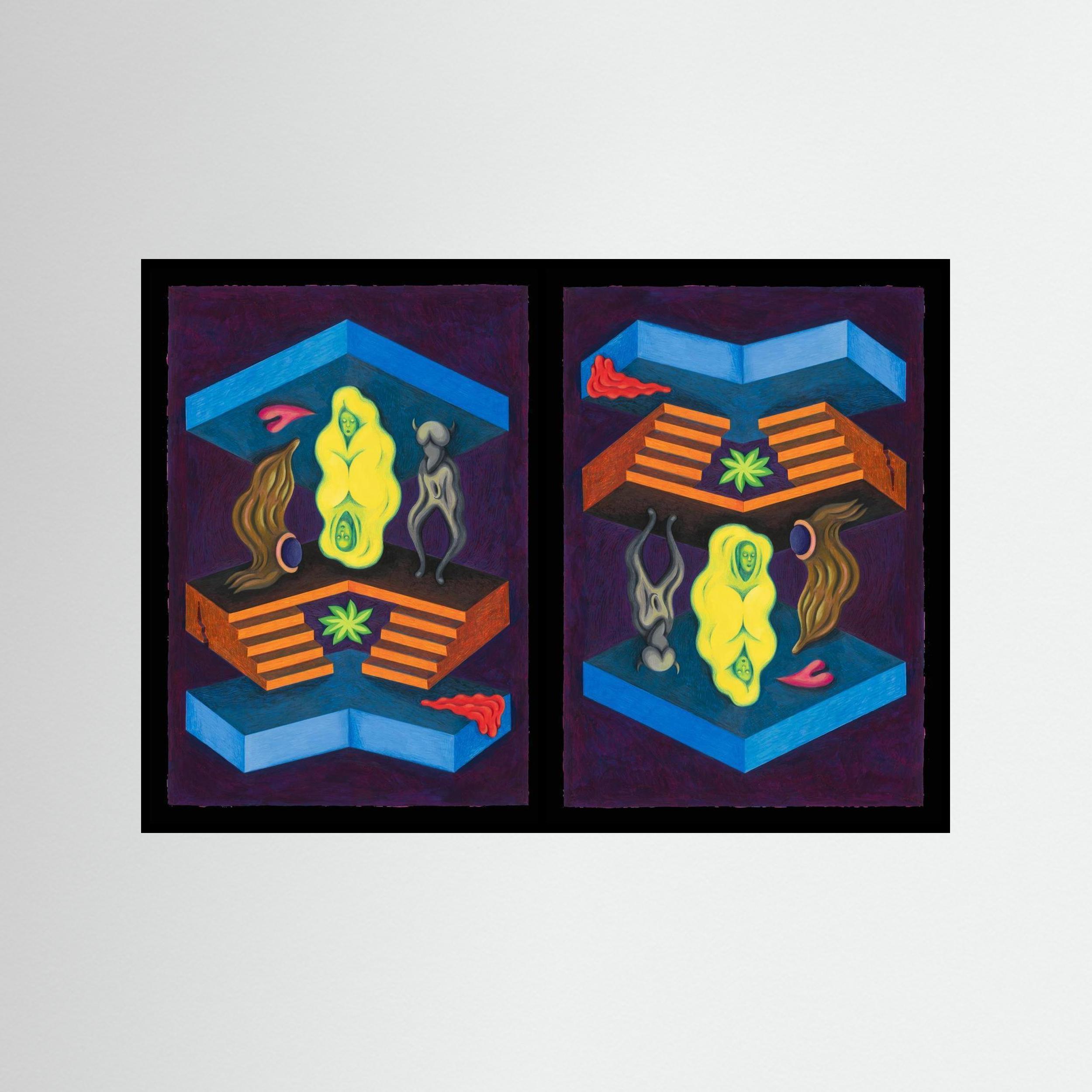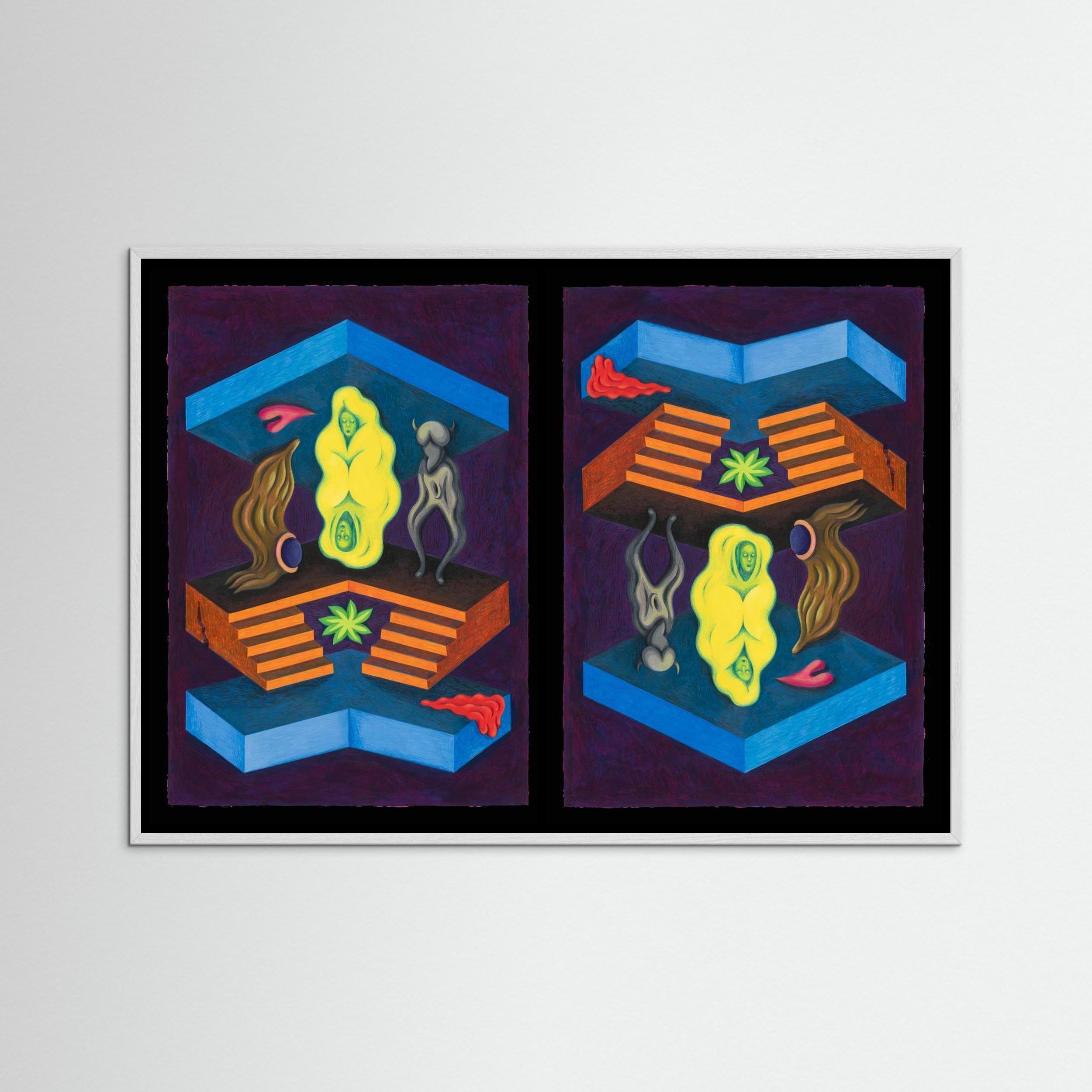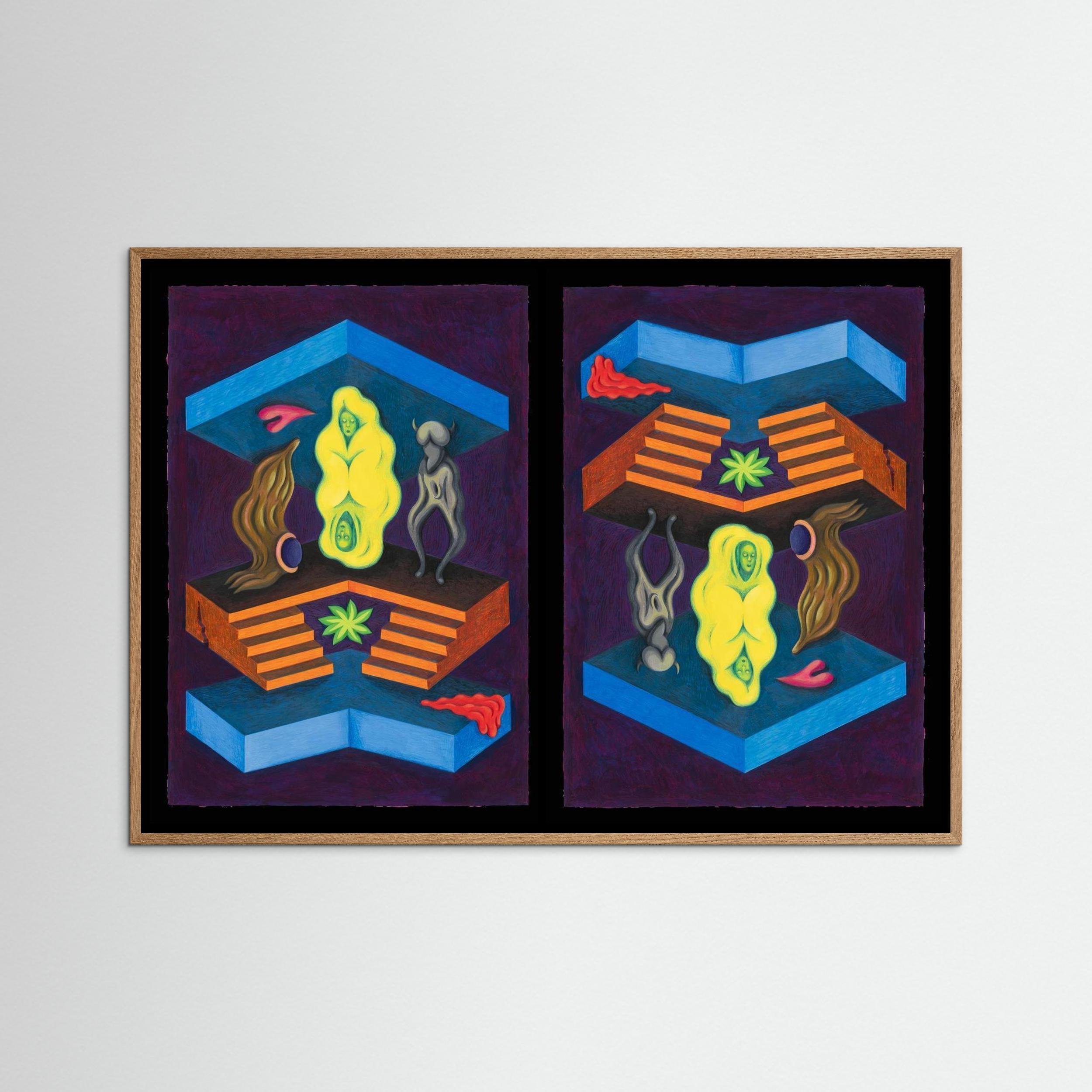 A reversible fine art print from Fanny Senocq’s UpsideDown collection – 22 original gouache paintings where every artwork transforms completely when rotated 180°. Cypher & In the In-Between explores identity, ambiguity and the space between meaning through abstract surrealist imagery. Two entirely different visual narratives are hidden within the same composition.