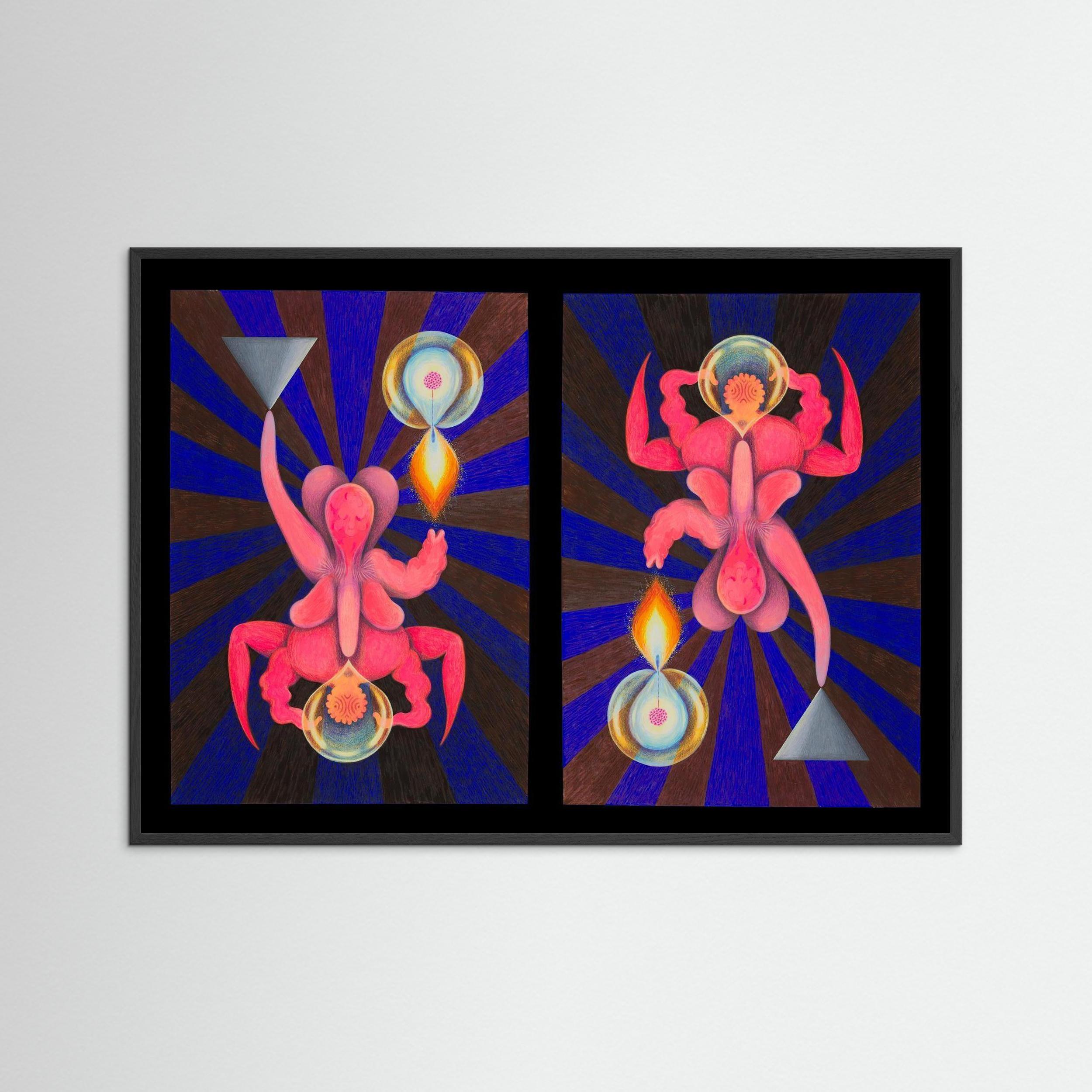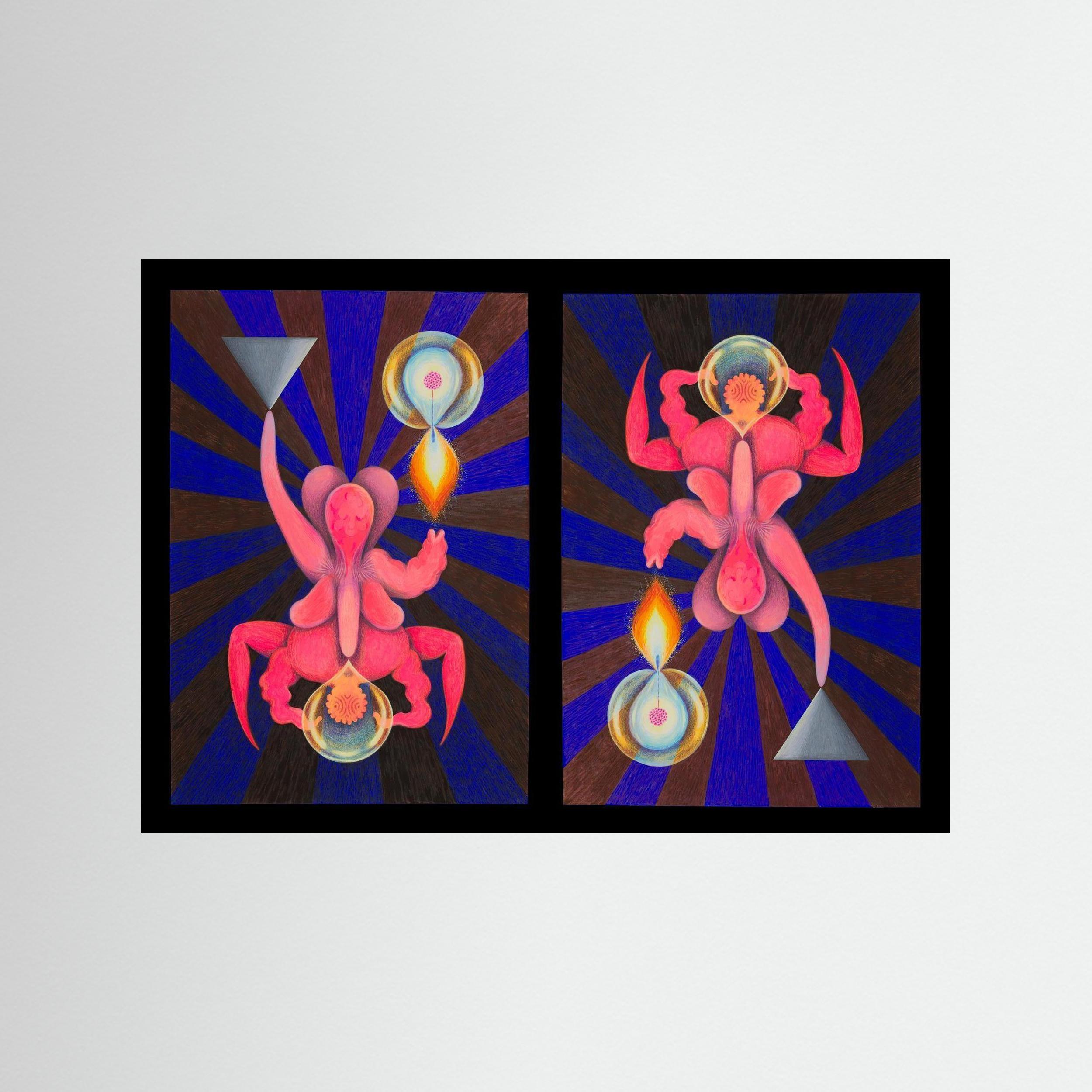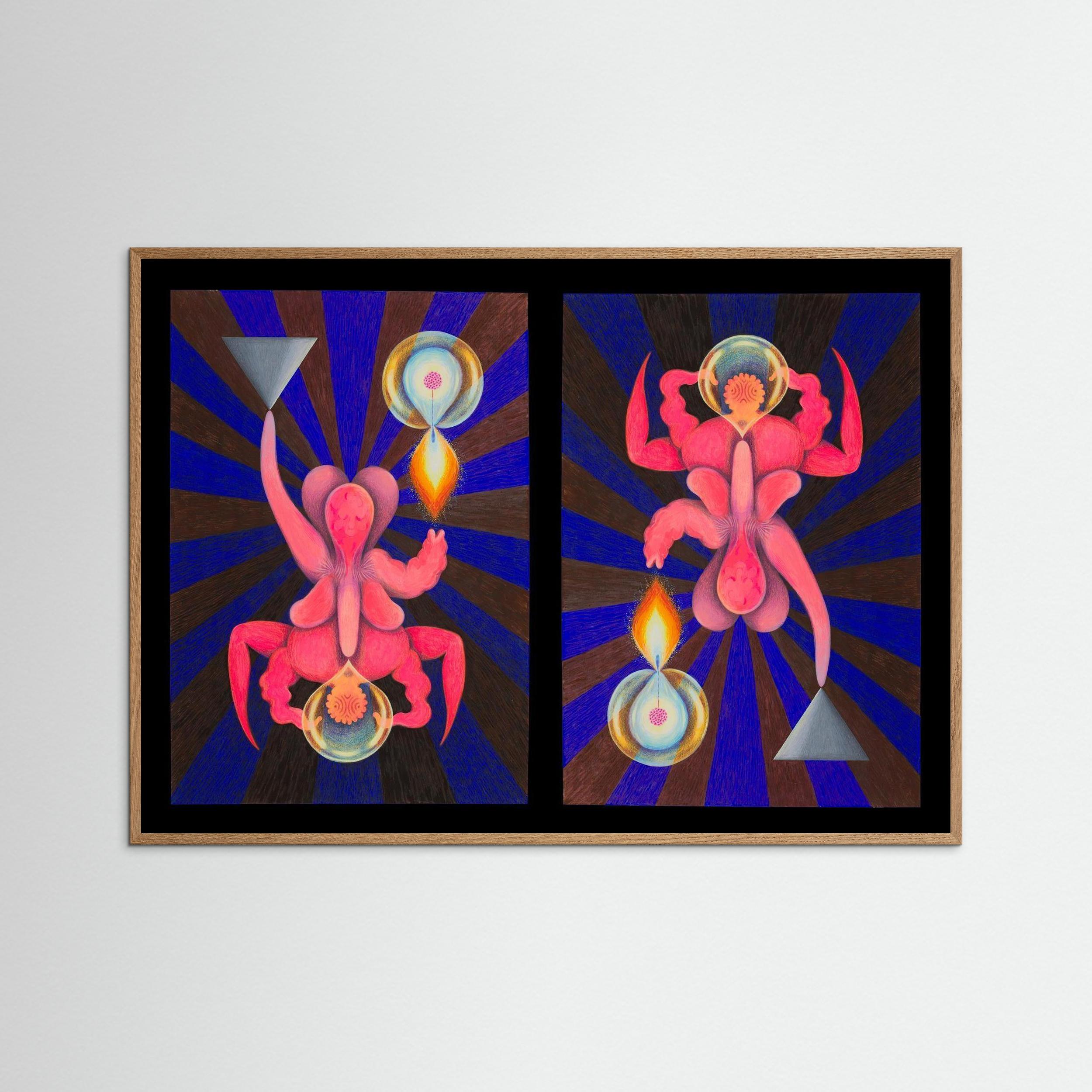 A reversible fine art print from Fanny Senocq’s UpsideDown collection. It’s Our Time Now & The Game Is Lost captures the tension between triumph and collapse, power and its inevitable dissolution. Two contrasting narratives emerge from the same gouache composition depending on which way you view it – a unique dual-perspective artwork for the thoughtful collector.