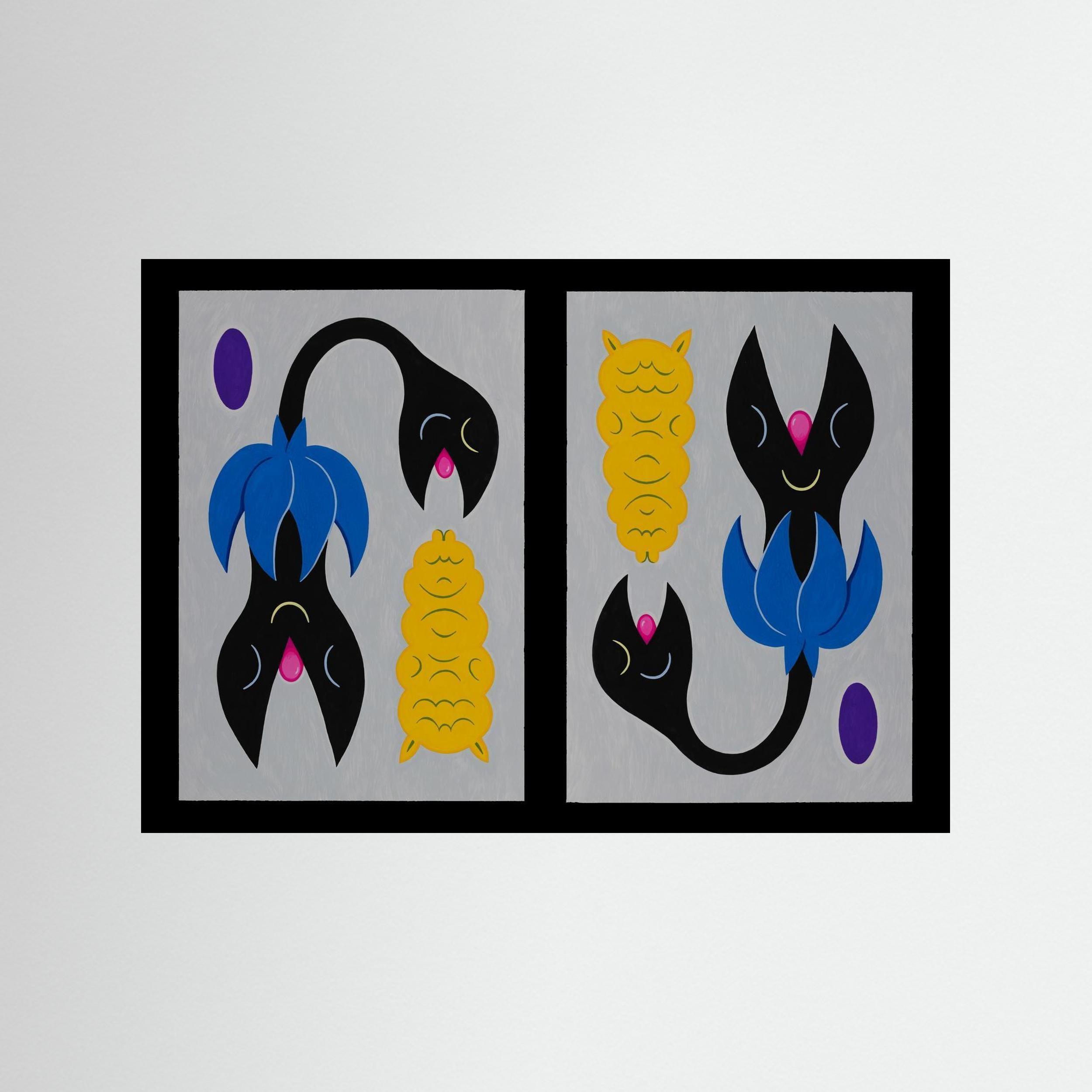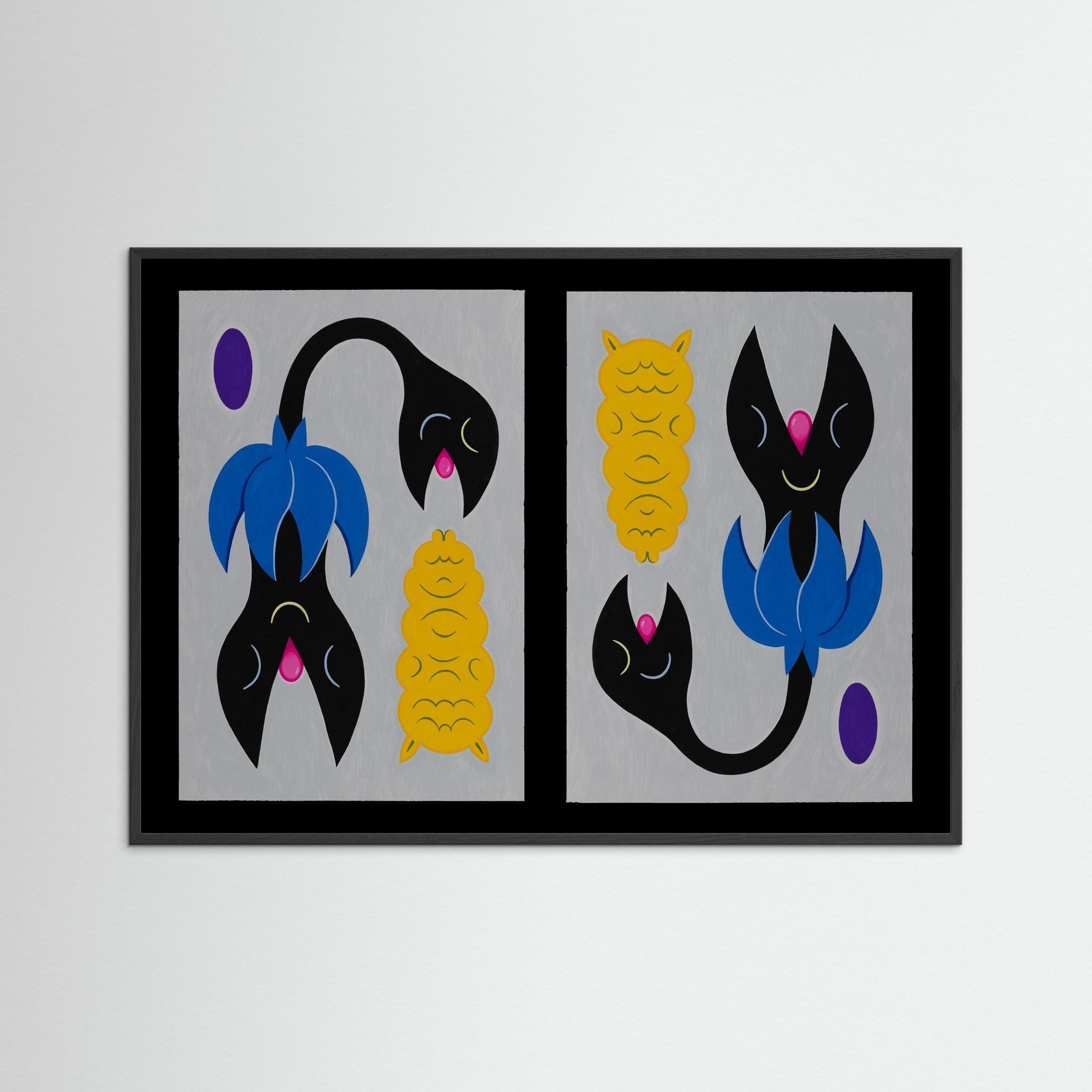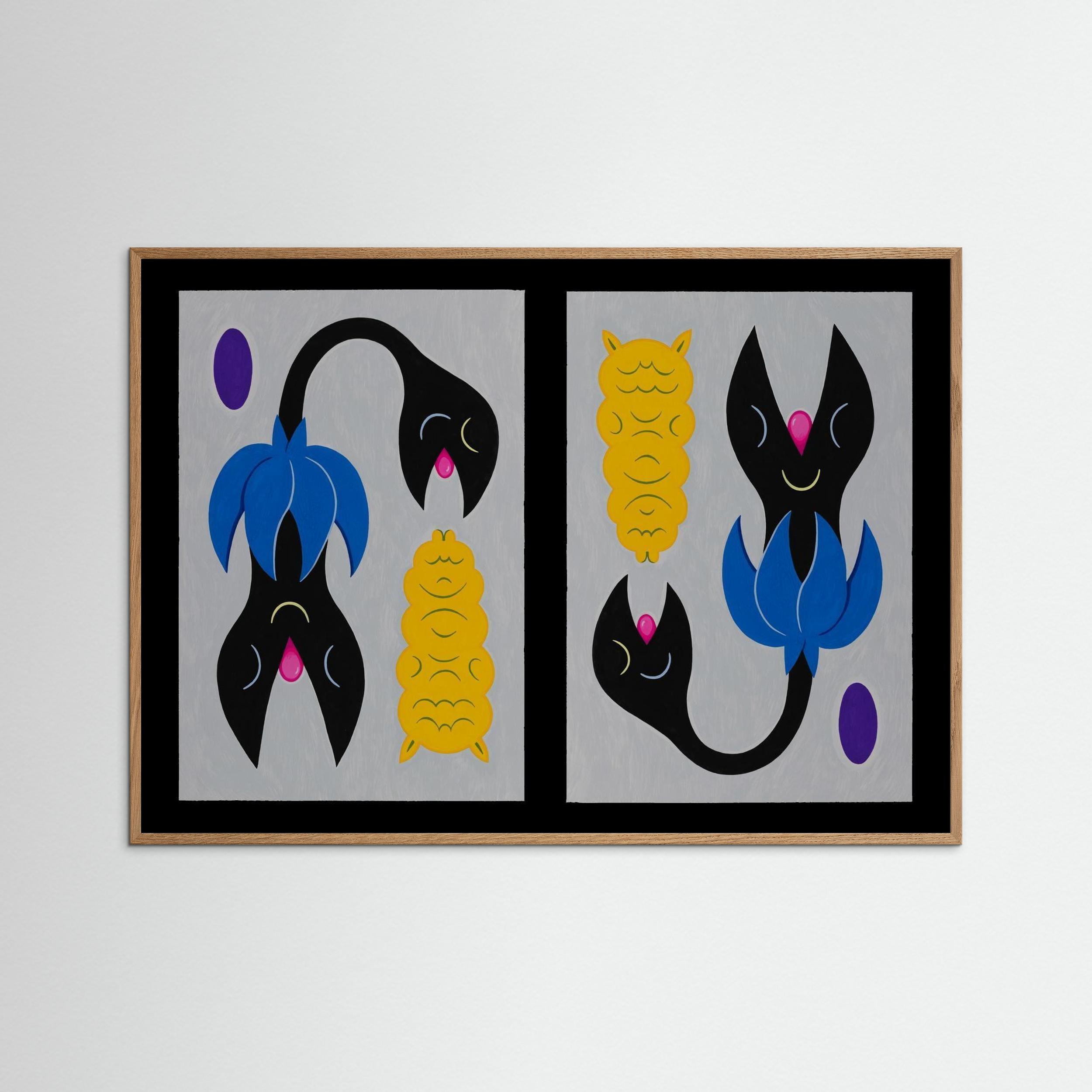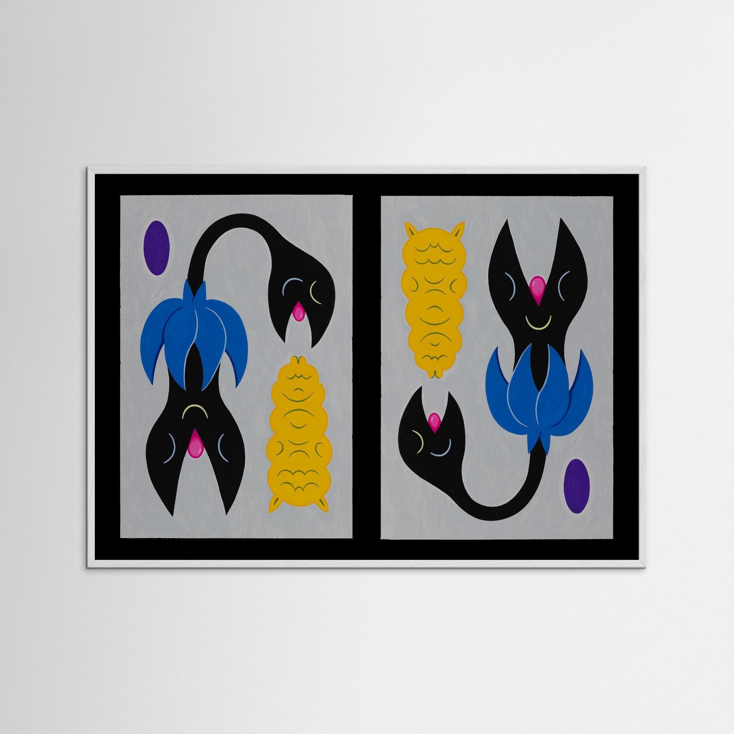 A reversible fine art print from Fanny Senocq’s UpsideDown collection. Black Swan & Cat’s Gold plays with the unpredictable and the illusory – the rare event that changes everything, and the dream that mistakes glitter for gold. Two sharply contrasting surrealist narratives emerge from the same gouache composition when rotated.