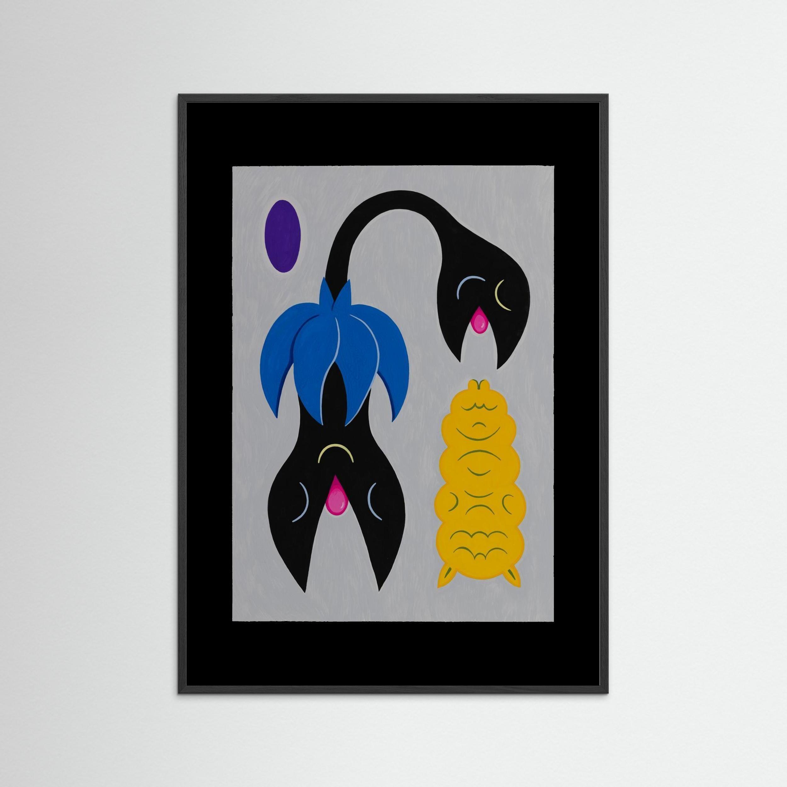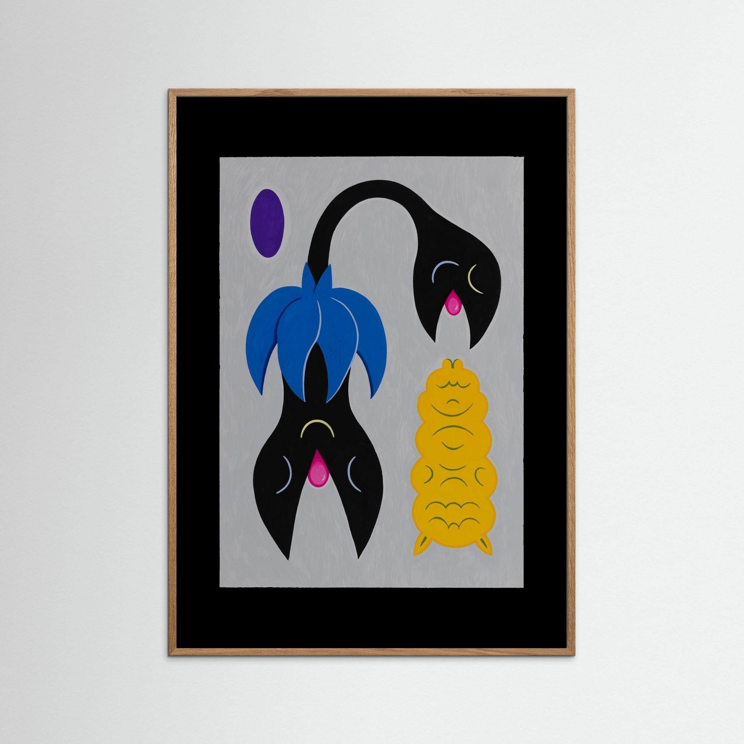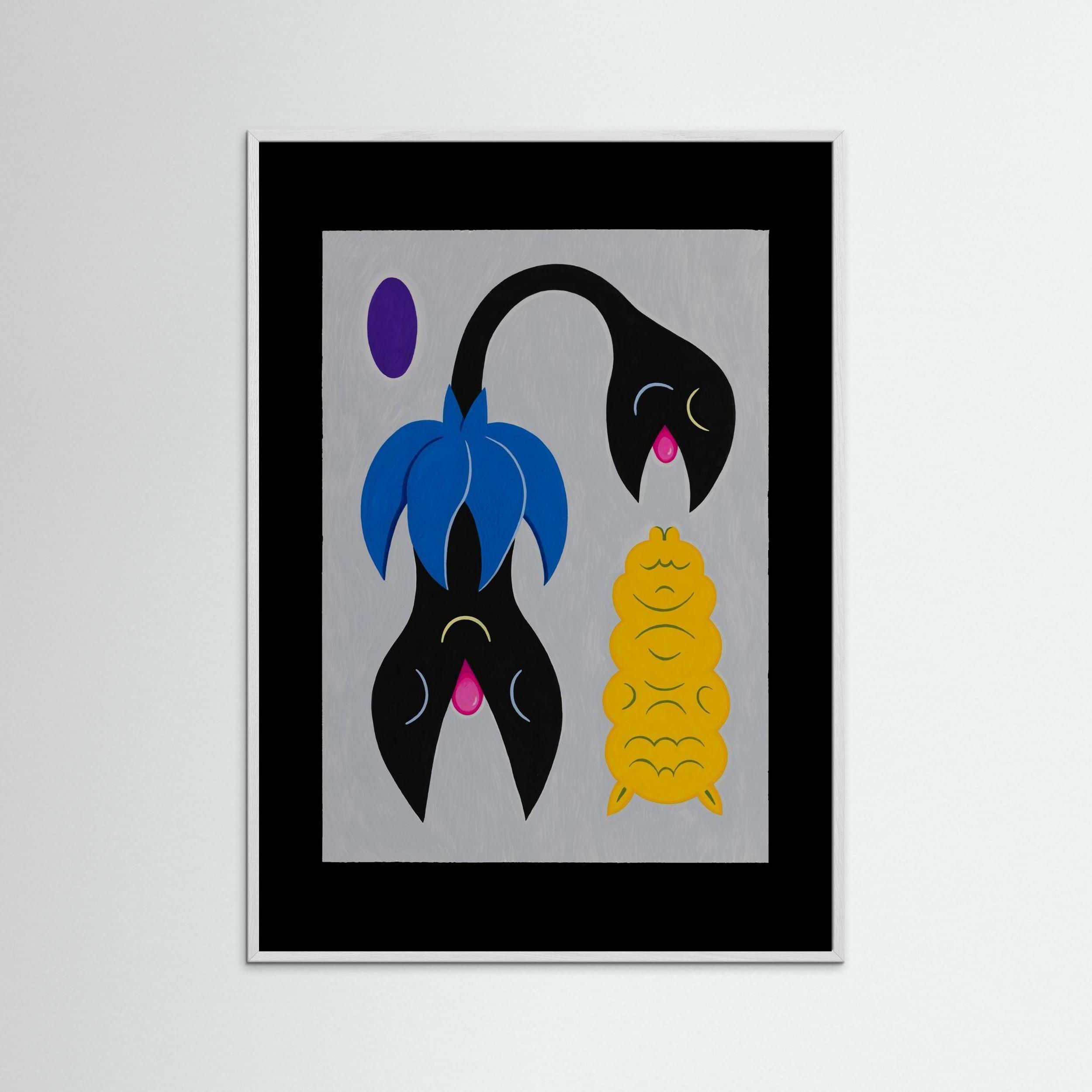 A reversible fine art print from Fanny Senocq’s UpsideDown collection. Black Swan & Cat’s Gold plays with the unpredictable and the illusory – the rare event that changes everything, and the dream that mistakes glitter for gold. Two sharply contrasting surrealist narratives emerge from the same gouache composition when rotated.
