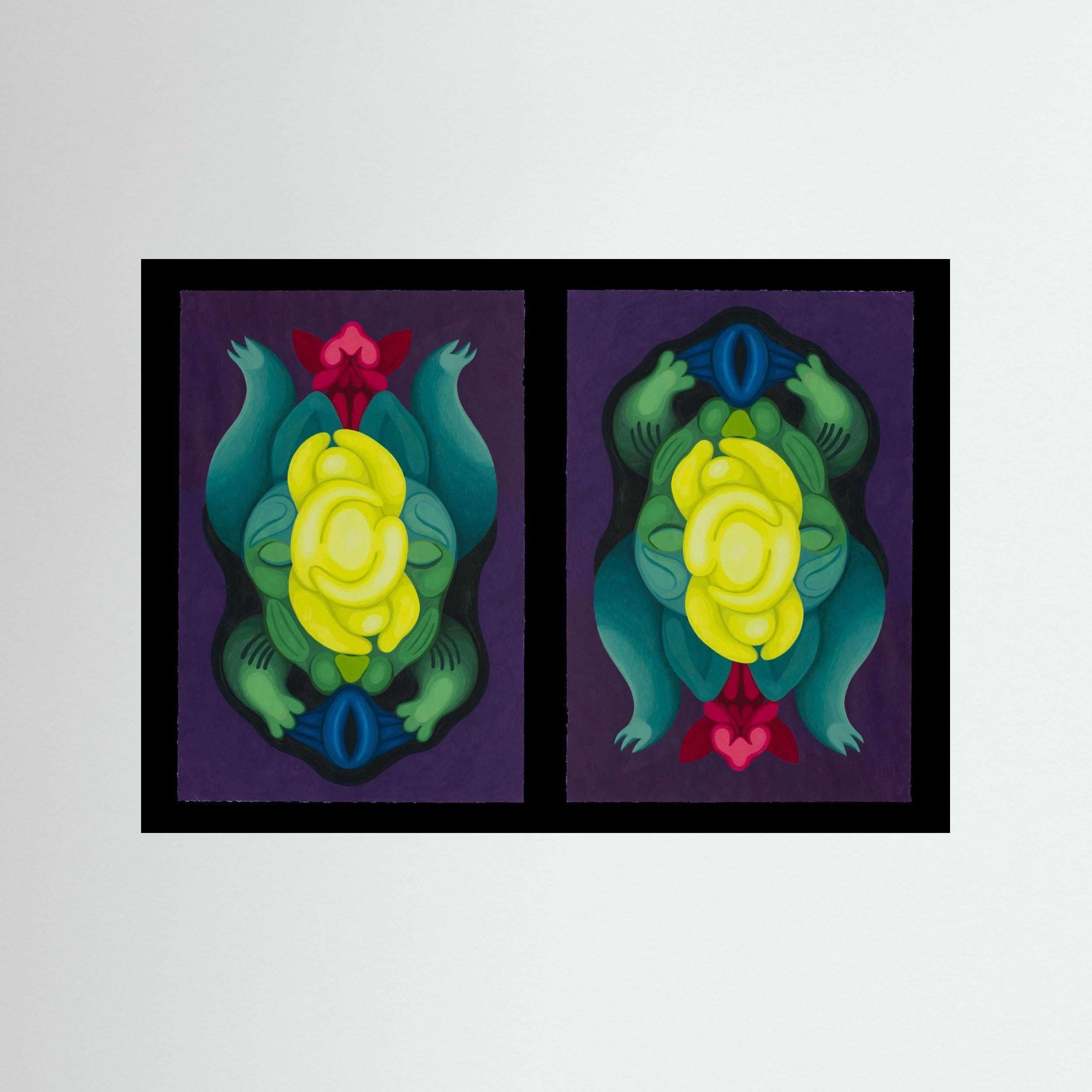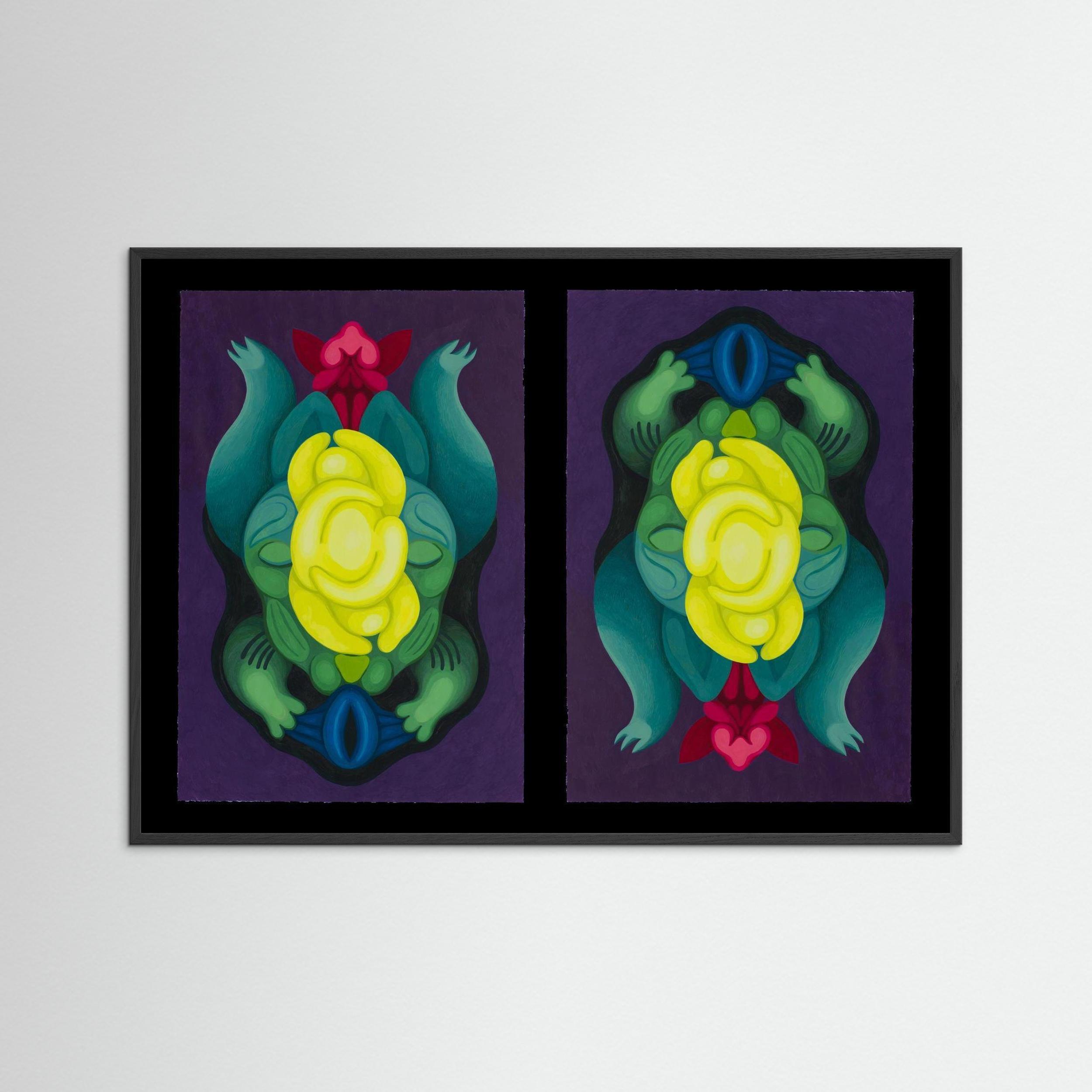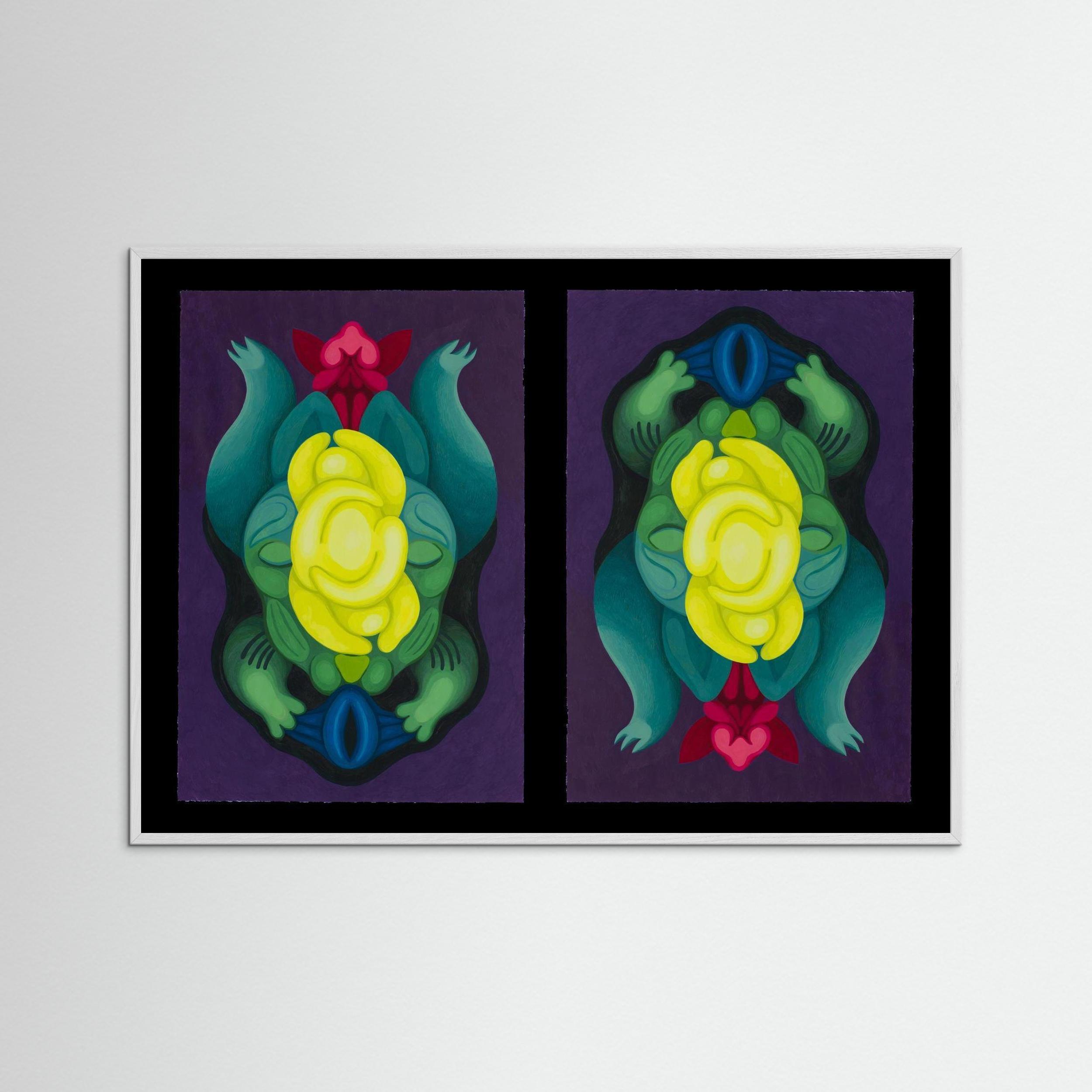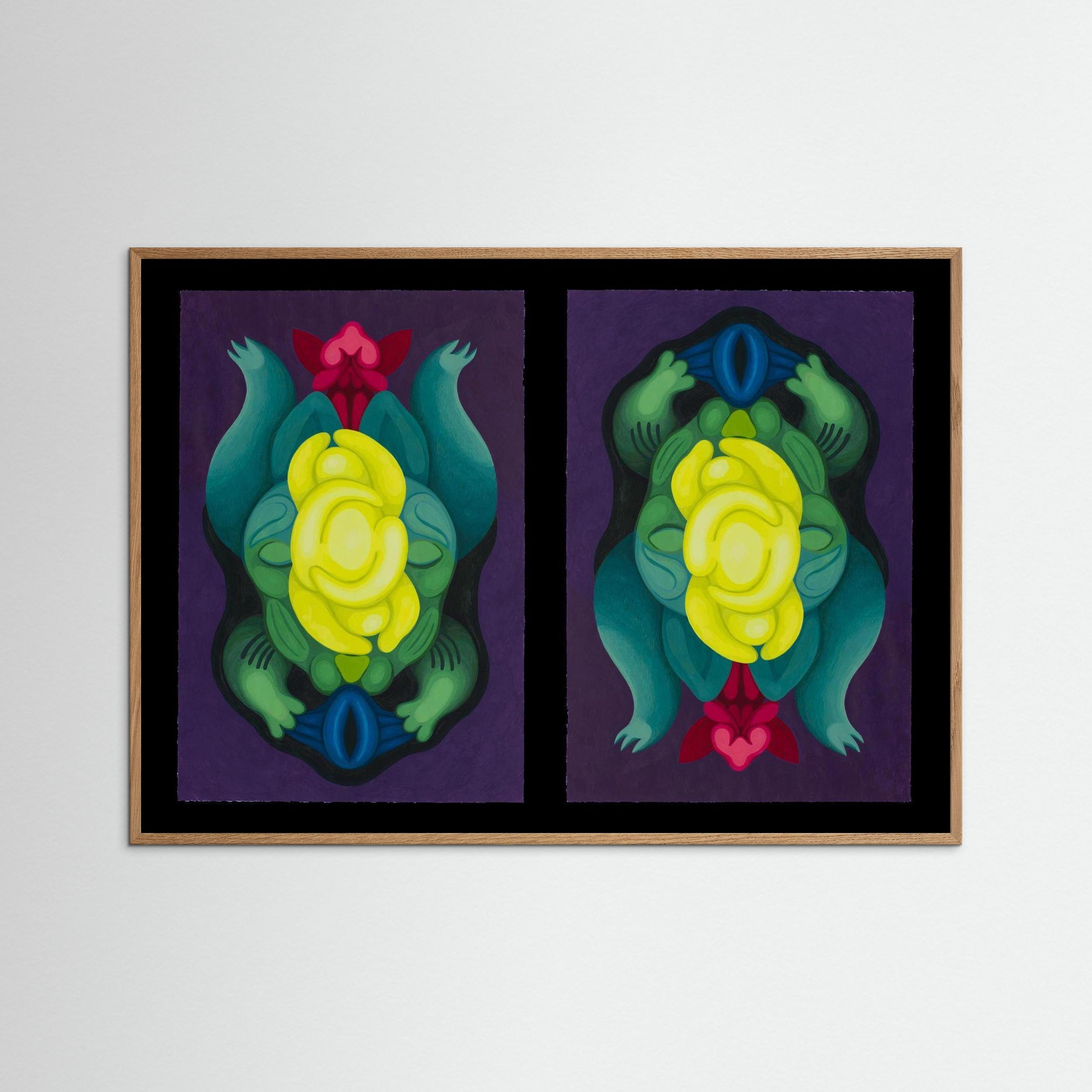 A reversible fine art print from Fanny Senocq’s UpsideDown collection. Rest on the Fairytale Rabbit & Deep Down moves between whimsical escapism and profound introspection – the childlike wonder of a fairytale and the quiet courage of looking inward. Two tender visual narratives share the same gouache composition in this final piece of the UpsideDown series.